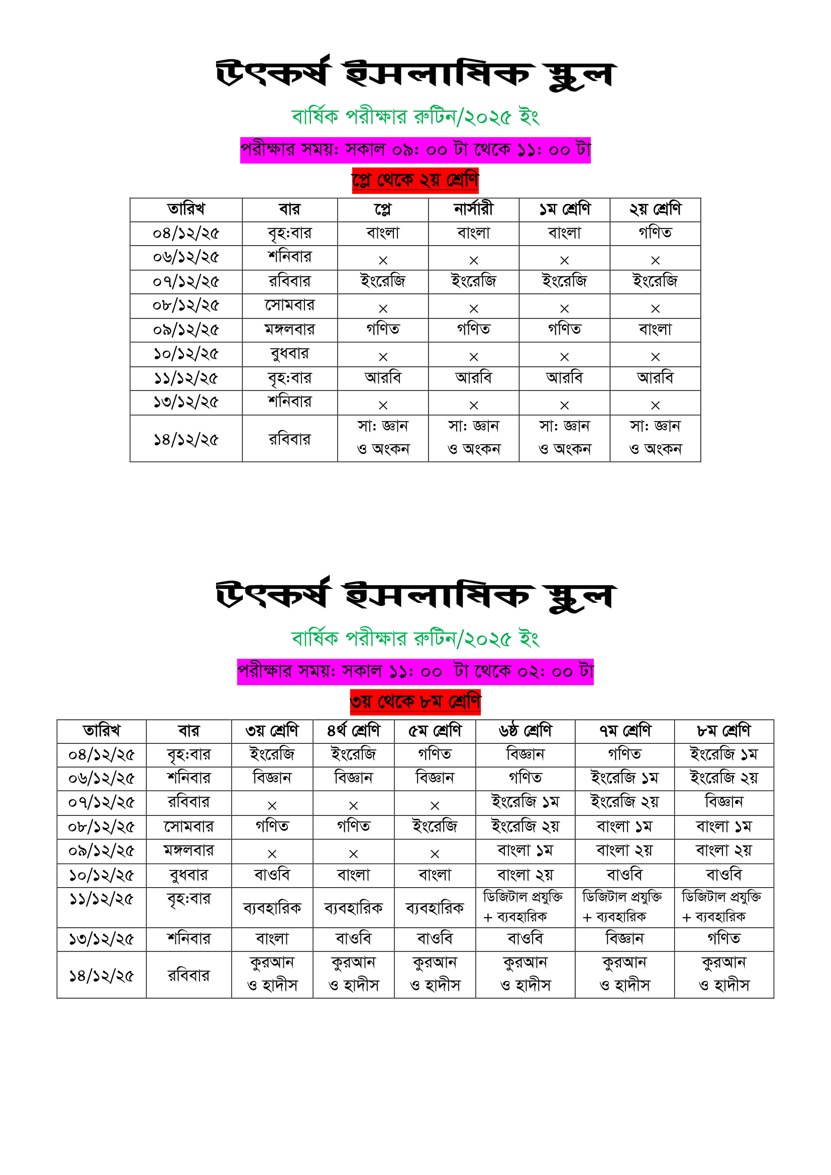 | 1 | নোটিশ: বার্ষিক পরীক্ষা ০৪ ডিসেম্বর-১৪ই ডিসেম্বর/২৫ইং পর্যন্ত চলবে, ইনশাআল্লাহ্। |